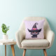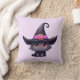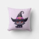 Fyll med en roligt Halloween-illustration för kattälskare. En svart katt med stor svart katt som bär en stor svart häxhatt med en purpur rosa bälte runt bommen.