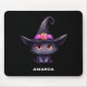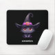 Mousepad med en roligt Halloween-temaillustration för kattälskare. En svart katt med stor svart katt som bär en stor svart häxhatt med en purpur rosa bälte runt bommen.