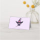 Ett bord-platskort med en roligt Halloween-temaillustration för kattälskare. En svart katt med stor svart katt som bär en stor svart häxhatt med en purpur rosa bälte runt bommen.