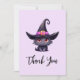 Tack för ditt kort med en roligt Halloween-temaillustration för kattälskare. En svart katt med stor svart katt som bär en stor svart häxhatt med en purpur rosa bälte runt bommen.