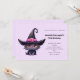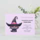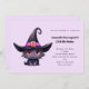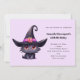 En födelsedagsinbjudan med en roligt Halloween-illustration för kattälskare. En svart katt med stor svart katt som bär en stor svart häxhatt med en purpur rosa bälte runt bommen.
