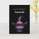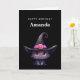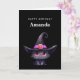 Födelsedagskort med roligten Halloween illustration för kattälskare. En svart katt med stor svart katt som bär en stor svart häxhatt med en purpur rosa bälte runt bommen.