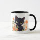 Ett beundransvärt litet svart kattunge bland det ljusa vår blommor.