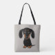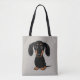 En mjuk, jackat svart och tanka Dachshund-valpen tittar upp. En söt wiener hund älskare's tote-väska, underbar för att köpa livsmedel eller husdjursartiklar. Den här roligten var en återanvändbar väska i hund gör en perfekt gåva till alla som kärlekar en tom hund. Besök Jenns Doodle World för fler Doxie-gåvor.
