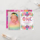 Fiesta 1:a födelsedagsinbjudan med levande mexikansk inspirerad vattenfärgad blommigt arrangemang och färgstark konfekt