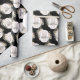 Utformningen har en vit modern blommigt ram med enkel typografi på svart bakgrund. Den kan anpassas genom att ändra namn och händelsemedatum för Bride. Om du vill ha fler anpassningar kan du gärna skicka ett meddelande till mig via Zazzle-butiken.