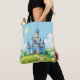 Cute blue and white castle with red flags on a bright summer day. This beautiful whimsical illustration with the sun, clouds, blue sky and green hill grass.