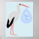 Den här poster innehåller en bild av en söt vit Stork med svarta fjädrar från svan på en blek blå bunt av filtar. Det finns en blå text på bunten som säger "Pojke". Det här är perfekten för att fira ett pojke.