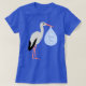 Den här söta skjortan har en bild av en söt vit Stork med svarta fjädrar från svan på en blek blå bunt av filtar. Det finns en blå text på bunten som säger "Pojke". Det här är perfekten för att fira ett pojke.