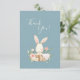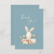 Cute "Tack"-kort med vattenfärgsbunny i faux wicker basket. Bakgrundsblå. Perfekt till dina babyduschgäster.