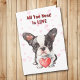 På framsidan av det här söta Valentinkortet finns en bild av en vacker Boston Terrier-valp-hund med rött hjärta. I texten längst upp står det: "Allt du behöver är KÄRLEK" Insidan sluter tanken och säger också "Glad Alla hjärtans dag". All text, fram och inuti kan anpassas till allt du föredrar.