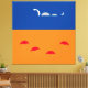 Sikta av Nantucket. Den här roligten, den vismliga, minimalistiska konsten, skildrar ett sött grått-havsserpent som närmar sig en gyllene orange-strand på djupa blåa havets vatten. Fyra röda paraplyer pekar ut förgrunden till den fantasifulla sammansättningen.