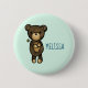 En knapp med en illustration av en brun tecknad som håller en gult daisy. Ange gröntens bakgrund för bleken. Anpassa med namn eller annan text.