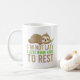Mugg har en söt brun sluttning och ordspråket "Jag är inte lat, jag jobbar hårt för att vila" mot en vit bakgrund.