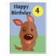 Detta färgstarka, redigerbara kort för barn visar en söt, brun hund med nummer 4 och texten "Grattis på födelsedagen" All text kan ändras så att den blir helt personlig.