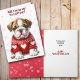 Framsidan av det här söta Alla hjärtans dagskort har en bild av en vacker brun och vit hund från Bulldog-valpen med röd vintertröja med vita hjärtan. Texten längst upp säger: "Kommer du att vara min VALENTINE?" Insidan säger "Jag tänka att du är HUND-BORTA CUTE" och "Glad Alla hjärtans dag". All text, fram och inuti kan anpassas till allt du föredrar.
