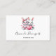 Business cards with an illustration featuring 2 white furry bunnies sharing a big pink heart. The girl bunny is wearing a cute bow on her head and heart-shaped glasses. The boy bunny is wearing an adorable little suit with a tie.