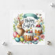 En levande och festlig illustration av Påsk. Den har en charmerande bunny omgiven av färgrika, strimlade Påskägg som skapar en glatt våningsplats. I bakgrunden står "Glad påsk" i en dekorativ banderoll med elegant. Sammansättningen stärks av blommigtens accenter, bland annat blommar och grönt, som bildar det centrala inslagen. Två vackert dekorerade kakor, fyllda med isbildning, sprinkler och bär, sitter bredvid kaninen. En kaka är försedd med ett ljus som symboliserar firande. Fåglar och fjärilar tillför en liten del av liv och rörelse till teckningen.