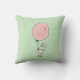 En kudde med en vit bunny som håller en stor rosa ballong flytande i luft. Ange på en ljust grönt bakgrund.