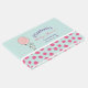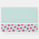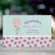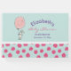 En handbok för babydusch med en vit vit knåpa som håller en stor rosa ballong flytande uppe i luft. Rosa poka-prickcirklar skapar ett sött och charmerande gräns. Ställ in på en ljusblå grönt-bakgrund.