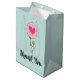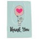 Ett tack för att du har en vit silikatbunny som håller en stor rosa ballong med ett hjärta i mitten. Trendigets typsnitt säger Tack.