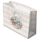 En stor presentväska med persika och vit stripe mönster. En digital illustration med vattenfärger. En charmig kanin med blå klänning sitta i basket omgiven av hennes ägg. Smör fladder runt basket som är dekorerat med en finare-blombukett.