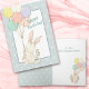 På framsidan av det här söt födelsedagskortet är en liten vit bunny som transporteras bort av färgfulla pastellballonger. I tealtexten i mönster ram står det "Grattis på födelsedagen". Inuti texten står det: "Gå framåt, kom undan!" Det finns en annan bild av bunny med ballonger och rosa blommor vid grund.