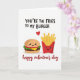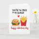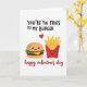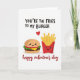 This greeting card features a smiling burger on the left and a cheerful carton of fries on the right, drawn as friendly characters. The burger is stacked with a tan sesame bun, green lettuce, red tomato, yellow cheese, and a brown patty. The fries stand upright in a bright red carton, their golden color popping against the white background. A red heart floats between them, tying the pair together. At the top, the message reads “YOU’RE THE FRIES TO MY BURGER” in red block lettering. Near the bottom, “happy valentine’s day” appears in softer red script. With plenty of open space, the focus stays on the characters and their sweet connection, making it a fun and affectionate Valentine’s Day card ❤️💌🍫.
