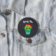 Lustigt knapp som säger: Hug mig, med en söt illustration av en grönt cactus sitta i en blomkruka. Big Kawaii ögon och med rött sombrero. Ange en svart bakgrund i en ritbordsbild.