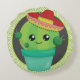 En rund kudde med en söt illustration av en grönt cactus sitta i en blomkruka. Big Kawaii ögon och med röd sombrero. Bakgrunden är ett mönster med kalkgröna virvelar.