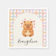 Cute capybara baby shower Napkins, showing a watercolor capybara surrounded by hearts within a pale cream arch and vintage pastel colored crisscross pattern in the background. CUSTOMIZABLE NAME underneath. Ideal baby shower Napkins for your capy arrival. Matching stationery and party supplies available.