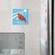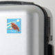 Kute kardinalmagnet. Litet fågel som står på en blommande träd gren under sol-strålarna på en ljusblå bakgrund. Text kan vara personlig.