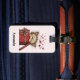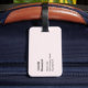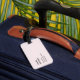 A luggage tag with a cute drawing of a little kitten poking its head out of a gift box.