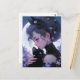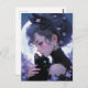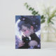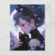 Det vackra dam klappar hennes söta svarta kattunge nära hennes hjärta med kärlek. Bakom dem lyser måne mycket intensivt i natten himlar, ge scenen en magisk och vismisk känsla. Blå blommor omger dem. Perfekt-kortet som ska skickas till vilken kattälskare som helst!