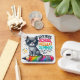 En glad utformning med en grått-katt med solglasögon som sitter på en färgstark penna.