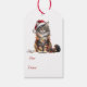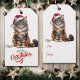 Den söta bilden på denna julklapp är av en grått-strimlad katt som har en julhatt och är inslagen i ljus. Den stiliserade texten i grund på framsidan säger "God jul" i grönt och rött. Baksidan av märkrn har samma kattbild, med anpassningsbarna röd. Se till att se matchande produkter i vår butik.