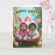 This card shows two small cats cuddled close in a rustic woven basket, dressed in soft hooded outfits with long bunny-like ears 🐰. The left cat is a ginger tabby in a rosy pink outfit with a matching bow, leaning slightly toward its companion as if sharing a quiet, trusting moment. Beside it, a grey tabby with faint stripes wears a white outfit with a cream bow, their faces turned forward with wide green-gold eyes that feel gently inviting. Light falls across their fur and the fabric, bringing out tiny whiskers, fluffy cheeks, and the basket’s braided texture. Behind them, a softly blurred spring scene stretches out with green foliage and a clear blue sky, giving the couple a cozy little spotlight. Across the top, a cheerful holiday greeting appears in green lettering, centered like a header above their ears 🌷. In the grass at the bottom, two smooth pastel pink egg shapes rest near the basket.