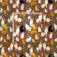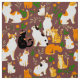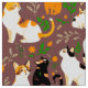 Fabriker i ett grönt mönster av katter i naturliga miljöer, omgivna av löv och blommor av grönt, som ställs mot en brunt bakgrund av kaffe och skapar ett charmerande och mysigt estetiskt material.