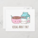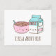 Ett vykort med en skål av frukostflingor med kärnor i kärlek och ett paket mjölk i den söta pastellen färger av blått och rosa. Rubriken på pun lyder: "Cereal Om dig!" Perfekt för Valentines day eller årsdag!