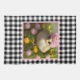 Söt kökshandduk har en digital konsmålning av en baby-chick mellan rosa och gula blommor med svart och vit gingham-bakgrunden i gräns.