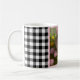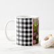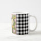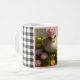 Söt kaffe mugg har en digital konsmålning av en baby chick mellan rosa och gula blommor med svart och vit gingham check gräns bakgrund.