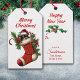 På framsidan av den här Helgdag är märkrn en bild av en berömvärd Chihuahua-valp som pissar upp sig i en ren röd strumpa. Bilden är omgiven av hal, röda bär och poinsettia blomstrar. I texten överst står det "God jul". Baksidan av märkrn har en annan bild av en hollisk rörelse, med text fält i rött som du kan anpassa.