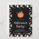 Späd barnens inbjudan till halloween fest med en illustration av en pumphink av slitsar och en bakgrund av kauldron, spöken och fladdermus. Illustrerad och designad av Patricia Alvarez.