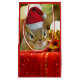 Den här söta chipmunken med en julhatt håller på att ta sig ut bakom en ljusröd Julklapp och guld-bugg för att önska dig "chipper helgdagars" för säsongen.