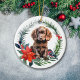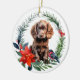 Här är en söt Helgdag prydnad som är en underbar keepy för alla som kärlek en Cocker Spanska hund. Framsidan har en vattenfärgsbild av en utandning av gräs nål, löv av mjuk grönt, röda bär och en röd poinsettia-blommar. En liten svart och röd tjurstjärtfågel är på utandningen mittemot blommarna av poinsettia. Högdagern är den söta chokladbrun Cocker-spanska valpen som sitter i mitten. Baksidan av dekoratet har samma utandningsbild, utan fågel eller valp, men med två anpassaden text fält.