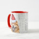 Mugg har en snygg Chow Chow-hund som bär en julhatt. Bakgrunden till mugg är täckt av en upprepande mönster av ord "svullnad". Bilden är ljus och glad, och det skulle vara perfekt för en jultemad gåva.
