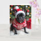 This holiday card features a lovely portrait of a cute black French Bulldog all dressed up for Christmas 🎅🏼🎄🎁. The dog wears a red and white sweater and a Santa hat with a fluffy white pompom. Its eyes are dark and soulful, shining with the light of the season. Against a cozy backdrop of soft lighting, the dog sits on a white shag rug, surrounded by hints of a Christmas tree and a red gift box. The scene is filled with warmth and festive cheer, making it perfect for spreading holiday joy to all who receive it.