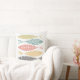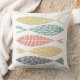 A cute coastal themed throw pillow of four fish in a modern, nordic drawing style in colors of yellow, green, pink and grey on a white background. The back of the pillow is in a mustard yellow. A simple, minimalist addition to any home decor.