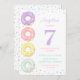 Cute and sweet kids birthday party invitations featuring watercolor donuts and colorful sprinkle with number '7' in a large bold serif font. All text can be personalized.
