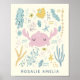 Den här söta anpassningsbarna av väggkonsten poster en vismisk illustration av en krabba omgiven av snäckor, flora, stjärnfisk med mera, i en söt pastellpalett färg av rosa, blått och gult. Anpassa det med ditt namn. Underbar presentidé!